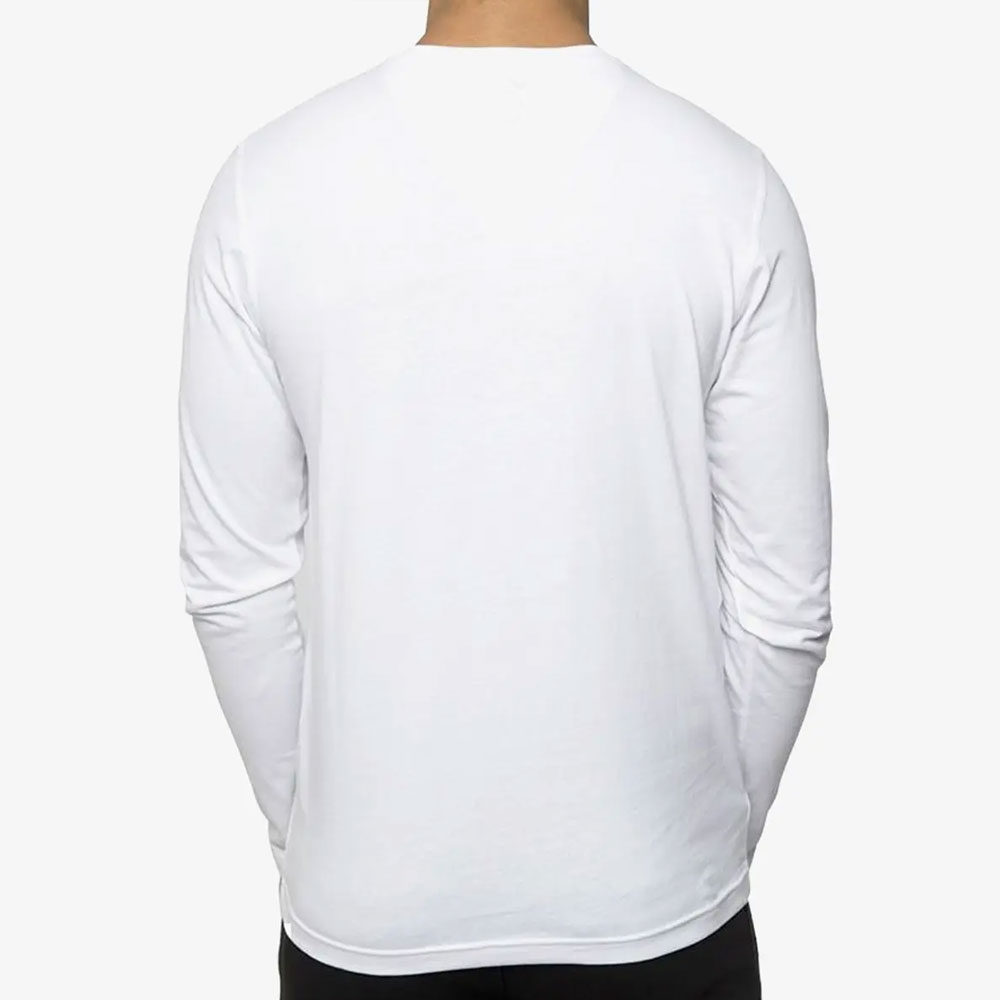 • Henley long sleeve T-shirt. This t-shirt comes in a long sleeve style, has a custom logo on the left chest side of the garment, and also has a badge on the bottom left of the t-shirt. It has a three-button neck closure and a logo print on the back of the neck.